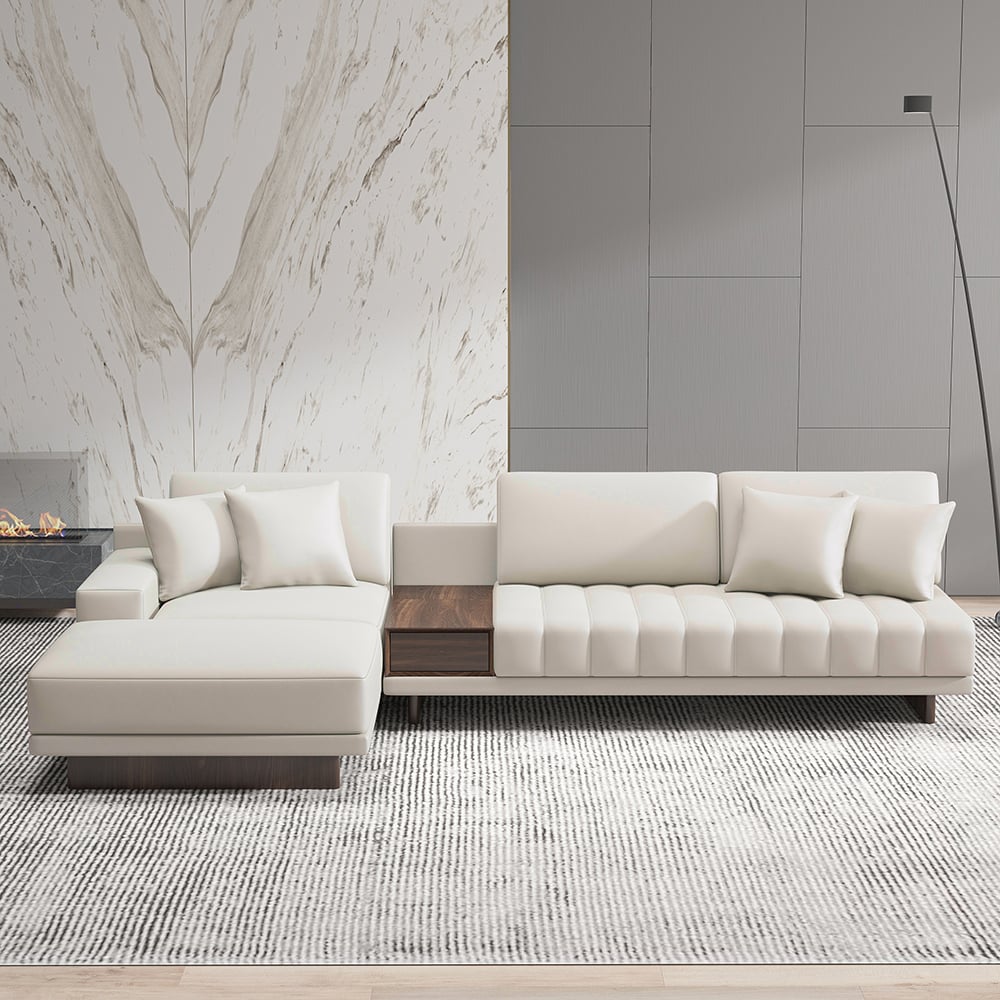 كنبة ركنة خشب طبيعي وقماش كتان - أوف وايت
